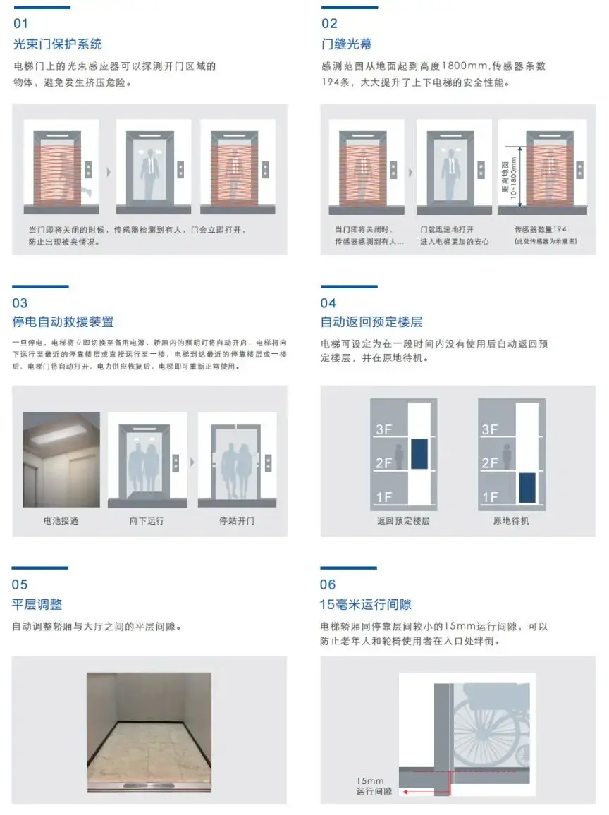 eHome运用停电自动救援、光幕传感、安全钳、超载保护装置、超速检测装置、精准平层、小间隙运行等多项领先的安全保障技术,让乘梯过程更安心。